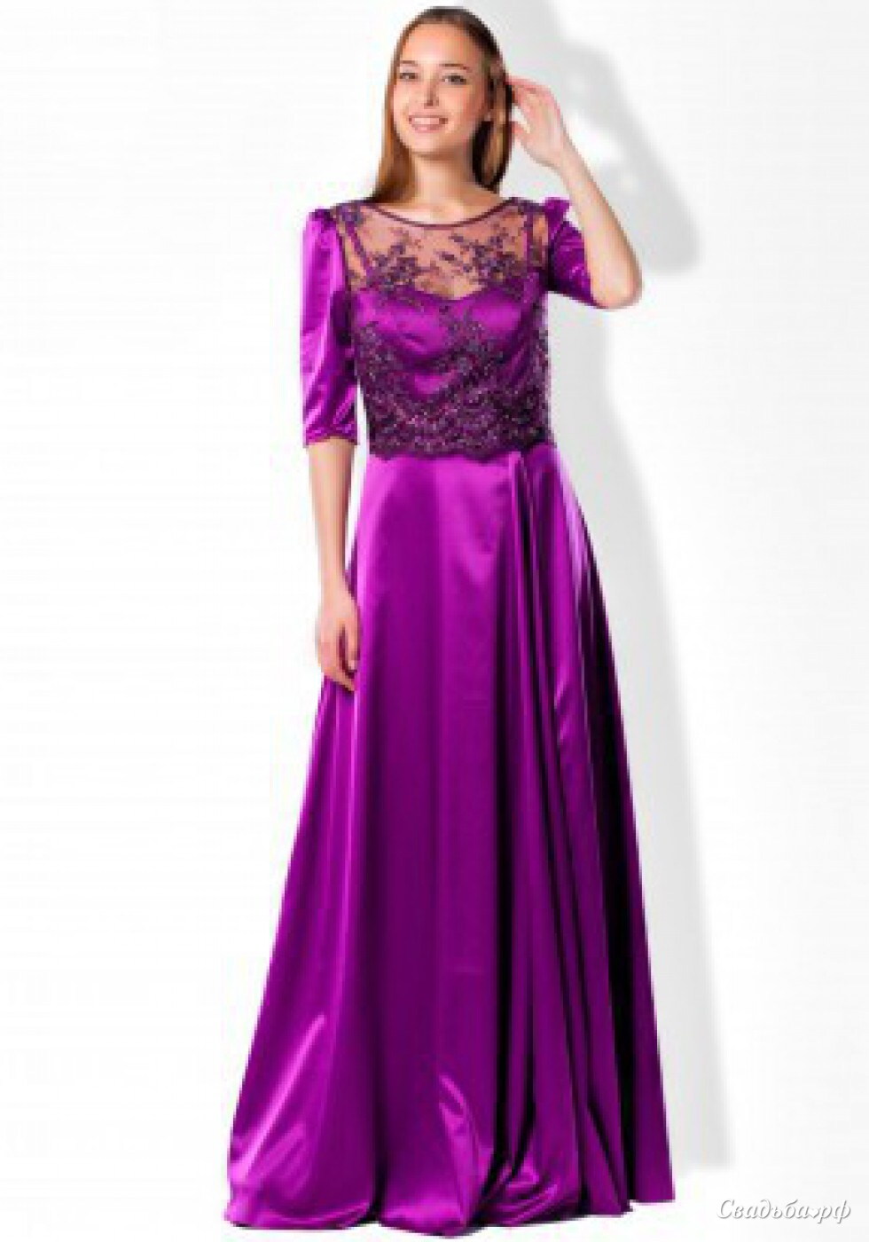 Вечернее платье фасона Принцесса с рукавом. Длина изделия – макси. Лиф украшен накладной деталью из гипюра. Рукав со сборкой по окату, длиной до линии локтя. Юбка с бантовой складой, смещенной к боку. Спинка с глубоким округлым вырезом. В центральном шве спинки расположена потайная тесьма–молния. Юбка на подкладке.