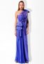 Актуальное вечернее платье трапециевидного силуэта с асимметричным верхом. Длина изделия — макси. Платье двухслойное, верхний слой полупрозрачный. Пояс и бретель изделия украшены стилизованными объемными бантами. Центральная часть переда декорирована аппликацией, вышивкой и пайетками. Юбка украшена отлетной шифоновой деталью.