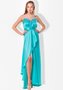 Вечернее платье трапециевидного силуэта, без рукавов. Длина изделия – макси. Юбка платья двухслойная: верхняя – на запах, нижняя – с высоким разрезом. Лиф изделия декорирован аппликацией, вышивкой и пайетками. В боковом шве застежка на потайную тесьму-молнию.
