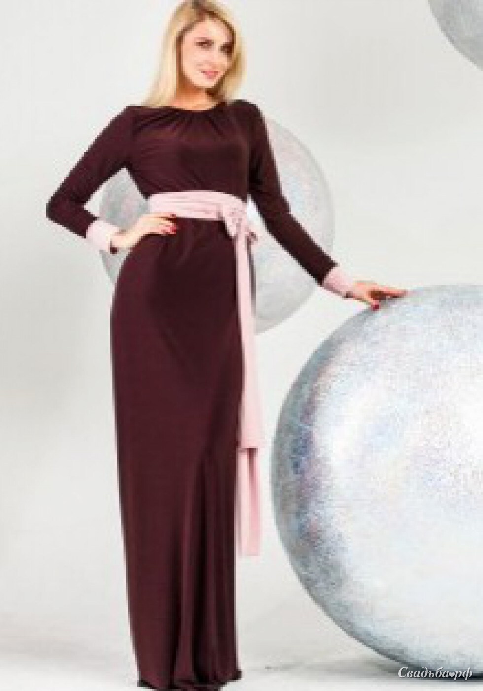 Вечернее платье в пол из приятного к телу трикотажа. Идеально садится по фигуре. В комплекте пояс нежно-розового цвета. Длинный рукав. Отличный вариант для выхода в свет.