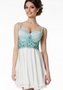 Романтичное платье-бюстье трапециевидного силуэта, на широких бретелях. Длина изделия – мини. Лиф платья украшен декоративными складами из основного материала. Верхняя часть изделия отделана расшитым гипюром. По спинке декоративная шнуровка.