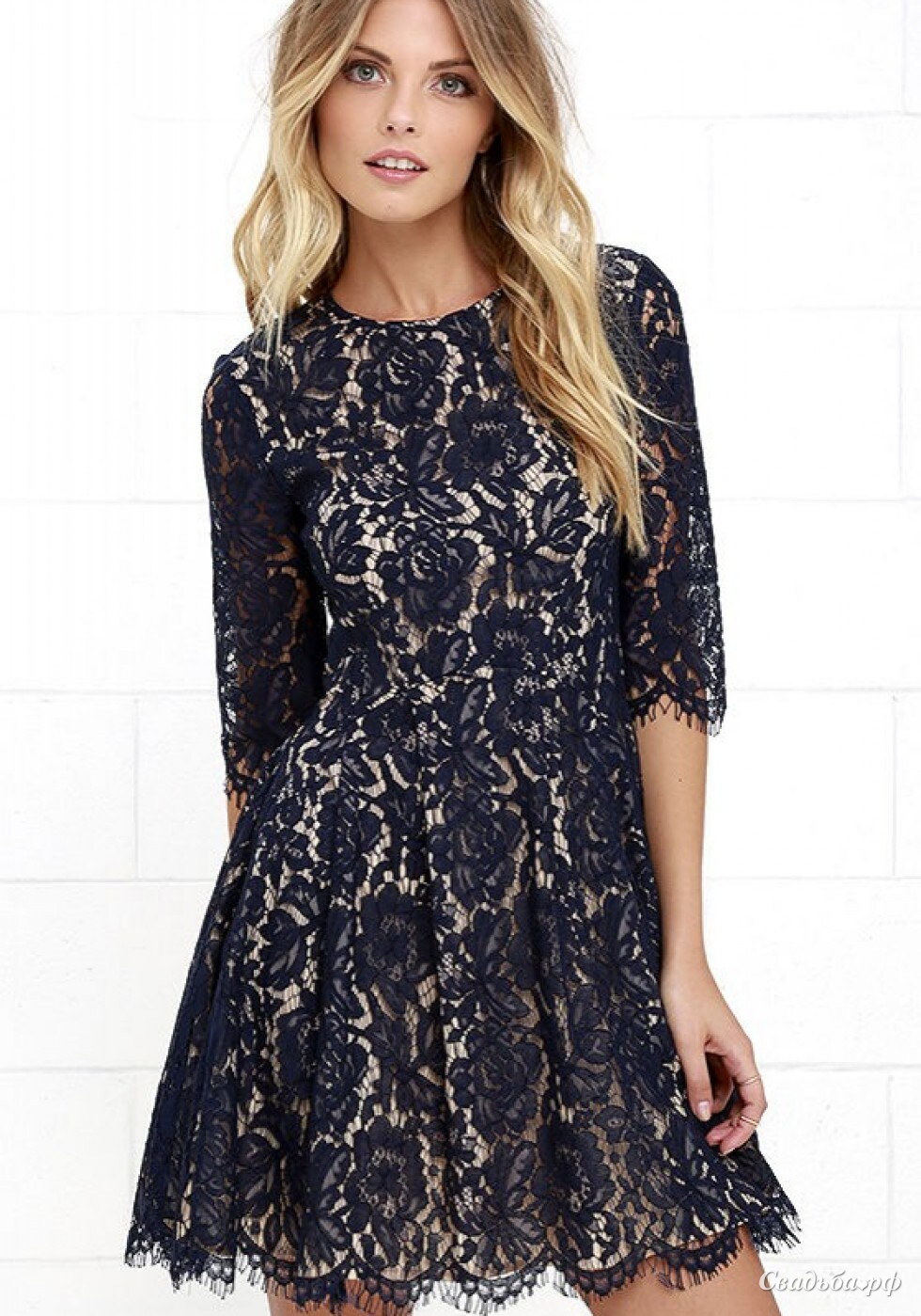 Кокетливое коктейльное платье из кружева на атласной основе. На спине молния. Есть широкий пояс в тон платья.
