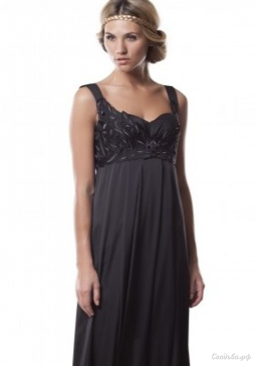 Элегантное вечернее платье-бюстье на широких бретелях, длина - макси. В стиле "Ампир". Состоит из длинного платья-бюстье и съемного корсета на шнуровке по спинке. Корсет декорирован вышивкой и лазерной перфорацией.