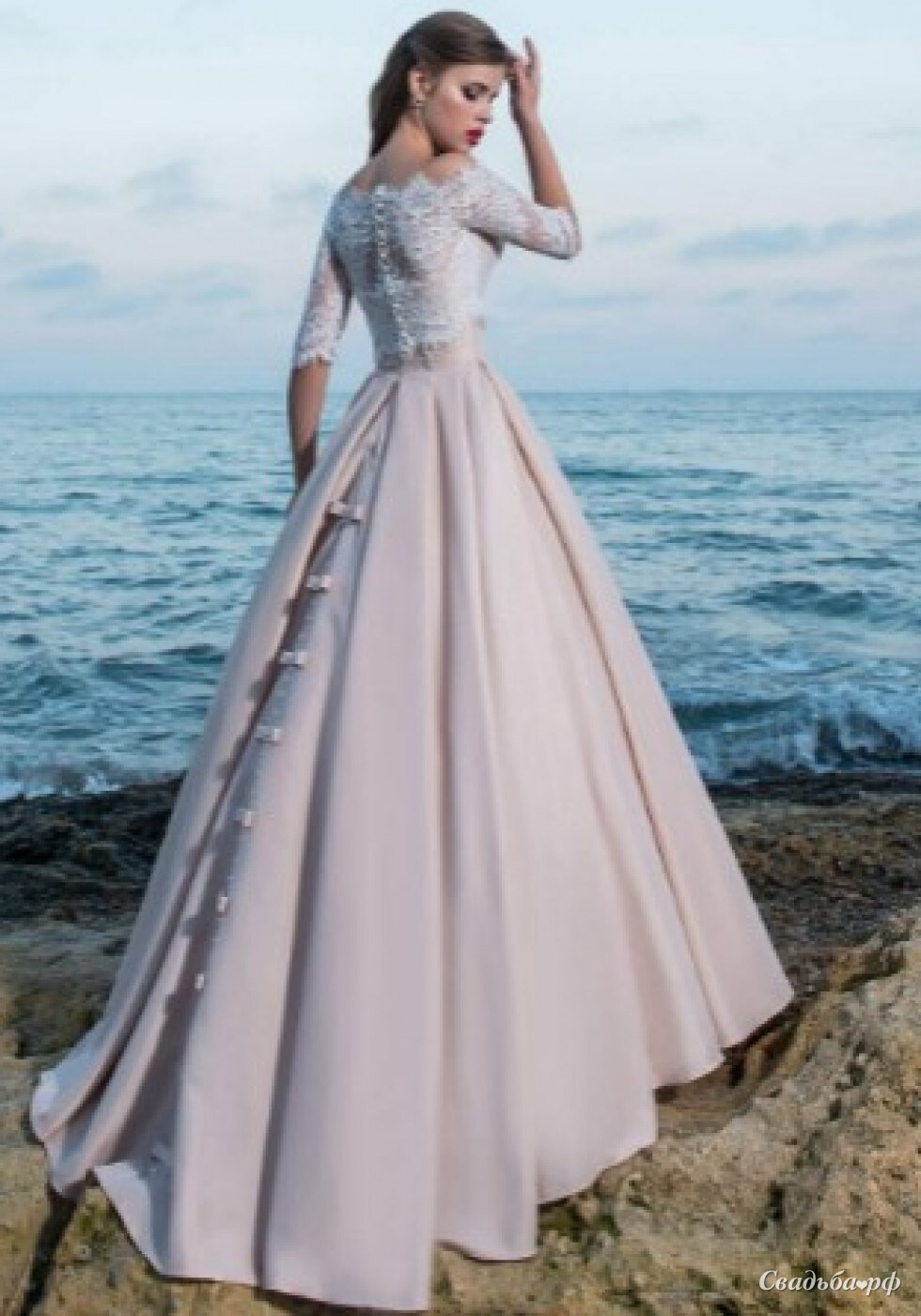Невероятно красивое вечернее платье из кружевного верха "открытое плечо" и атласной юбки с великолепным шлейфом. Платье пришлось по душе и некоторым невестам, тем, кто считает, что свадебное платье может быть не только белым ;)