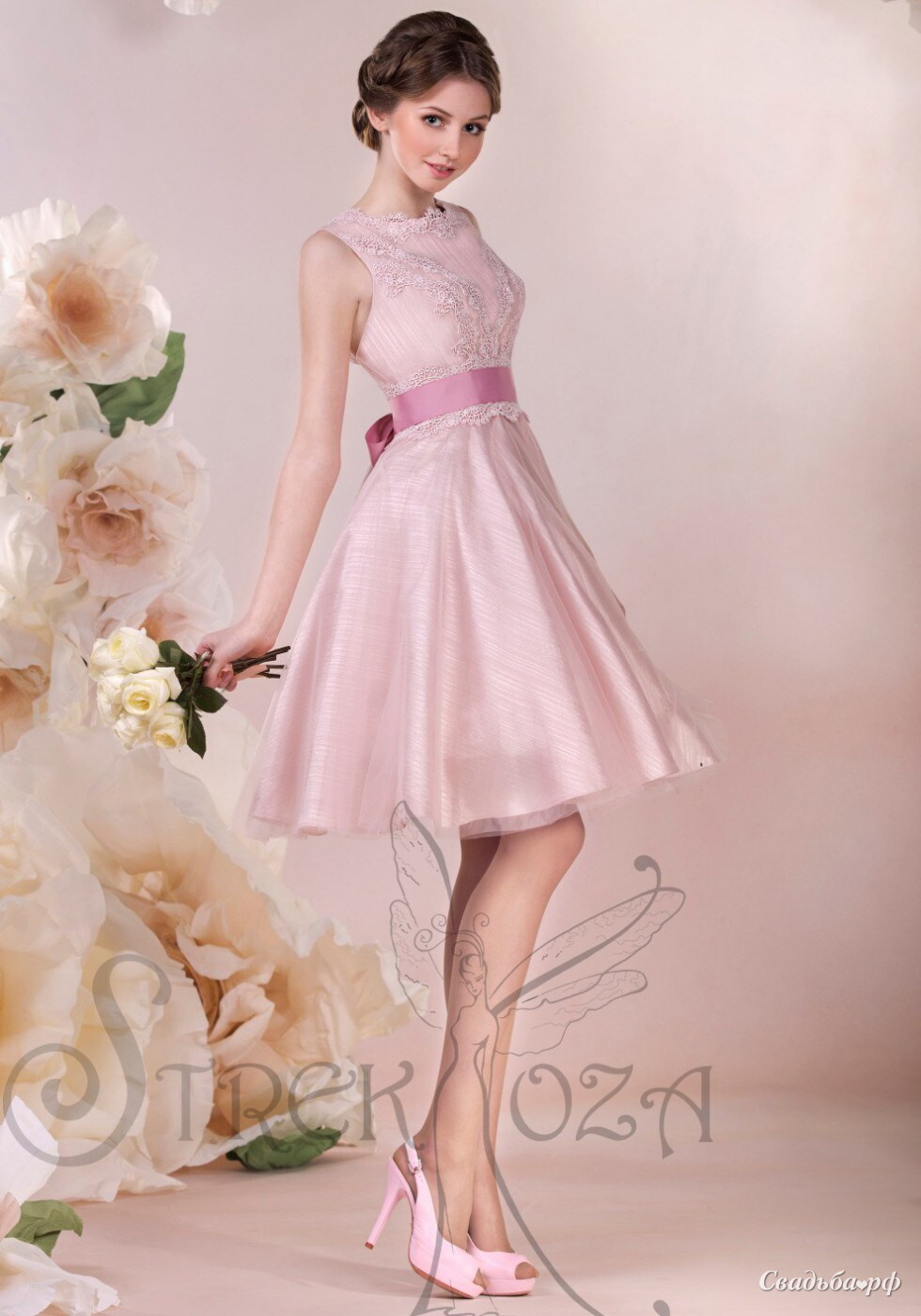 Нежное розовое платье идеально подойдет для подружки невесты. Закрытый лиф со скромным округлым вырезом и строгий корсет расшиты очаровательными цветочными узорами из бисера. Линия талии выделена широким поясом контрастного цвета, сзади завязанным на бант. Пышная юбка средней длины выглядит романтично и изысканно одновременно.