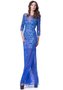 Длинное платье с длинными рукавами выполнено из полупрозрачной сетки цвета сапфир расшито камнями, пайетками и стеклярусом, образующими завораживающий узор. Нежный цвет платья, решение силуэта в стиле "футляр" и ноги на просвет в сочетании с длинным рукавом способствуют созданию яркого и совершенного образа. Платье идеально подходит для любой вечеринки.