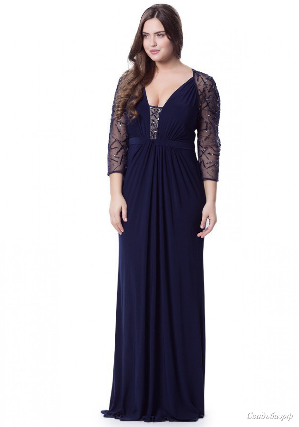 Элегантное платье для женщин пышных форм. Сочетание трикотажа и гипюра – истинное воплощение романтики и женственности. V-образный вырез подчеркивает форму груди, слегка приподнимая ее. Небольшие рукава, сделанные из тончайшего кружевного гипюра с оригинальной вышивкой, добавляют в образ утонченности и нежности, скрывая полноту рук, при необходимости. Талия в фасоне этого платья завышенная, благодаря чему силуэт визуально вытягивается.