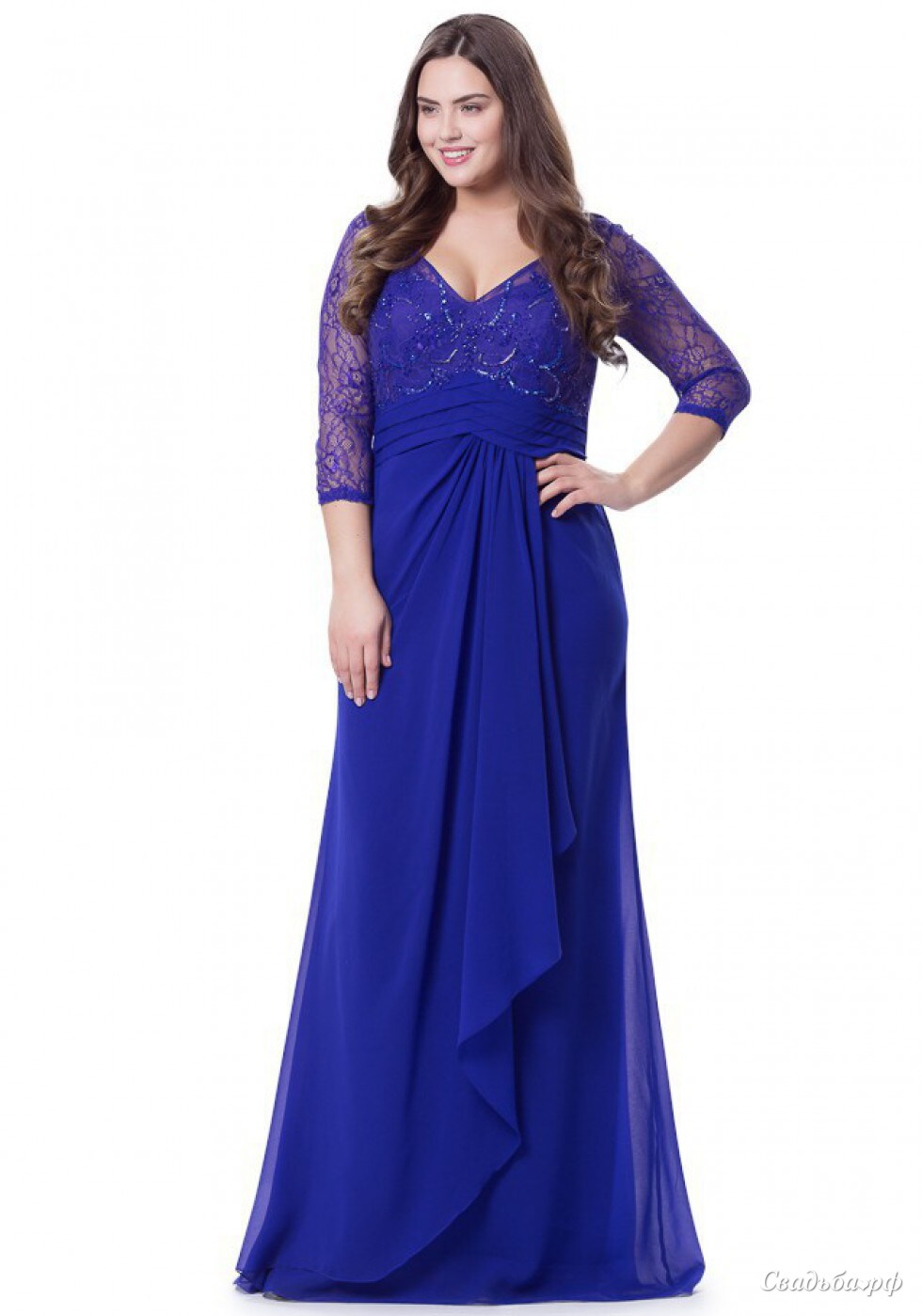 Оригинальное длинное вечернее платье для женщин с пышными формами – отличный наряд для торжественного мероприятия. Косой крой садится на любую фигуру, подчеркивая лишь ее достоинства. Платье выполнено из шифона в дополнении с нежным и мягким гипюром на корсете и рукавах, которые помогают скрыть, при необходимости, полноту рук. Сверху трикотажный подклад завуалирован нежным кружевным гипюром, который идеально садится на любую фигуру. V-образный вырез подчеркивает и придерживает грудь. Талию подчеркивает пояс из шифона, который визуально делает силуэт стройнее.