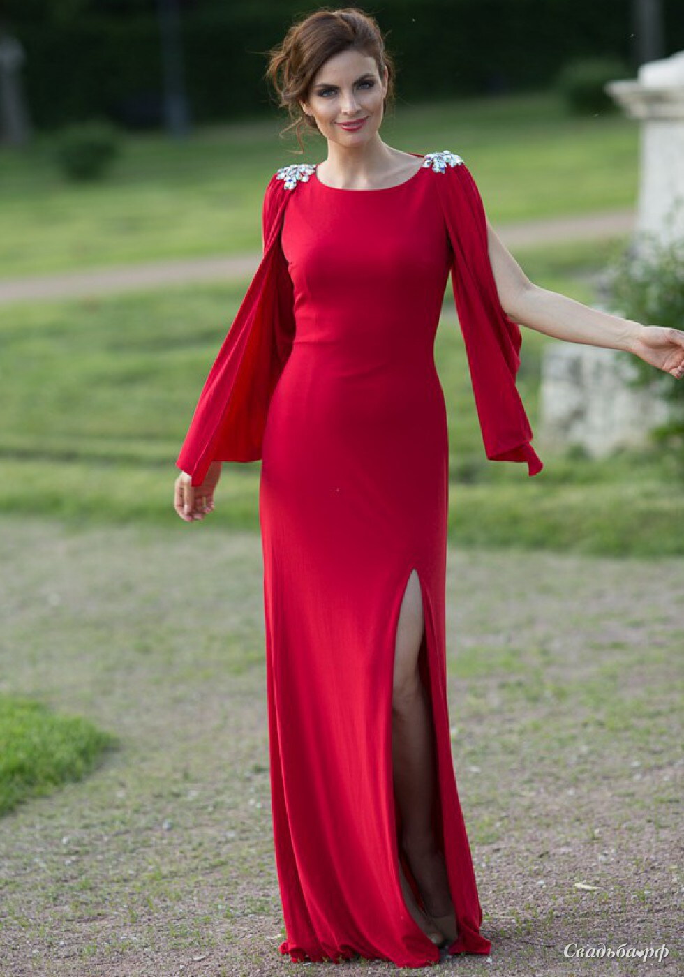 Элегантное красное вечернее платье подчеркнет Вашу женственность. Вырез округлый, сдержанный. Рукава с разрезами. На плечах расположены красивые декоративные композиции из бусин и бисера белого цвета. На спинке глубокий V-образный вырез. Юбка длинная, мягкая, расширенная книзу спереди разрез.