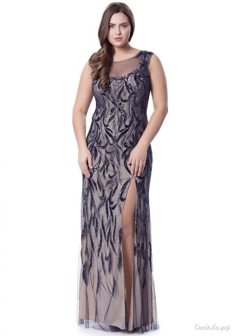 Длинное облегающее платье с разрезом мерцает и искрится! Платье сверху до колен расшито блестящими пайетками разного размера. Оригинальная вышивка переходит в сплошной узор, открывая тонкий и нежный материал платья. Декольте в форме сердечка завуалировано сеткой.