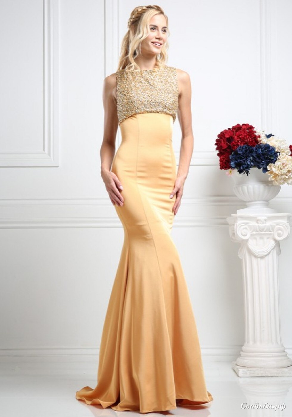 Силуэт "русалка", роскошный золотой цвет и ультрамодный топ делают это платье поистине индивидуальным!