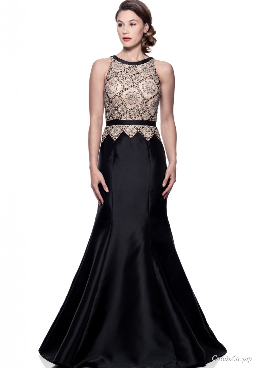 Роскошное! Геометрический рисунок вышивки на топе платья смотрится очень оригинально! Силуэт "русалка" подчеркивает все достоинства фигуры! А классическое сочетание шампань/черный уравновешивает образ, делая его ярким и элегантным одновременно!