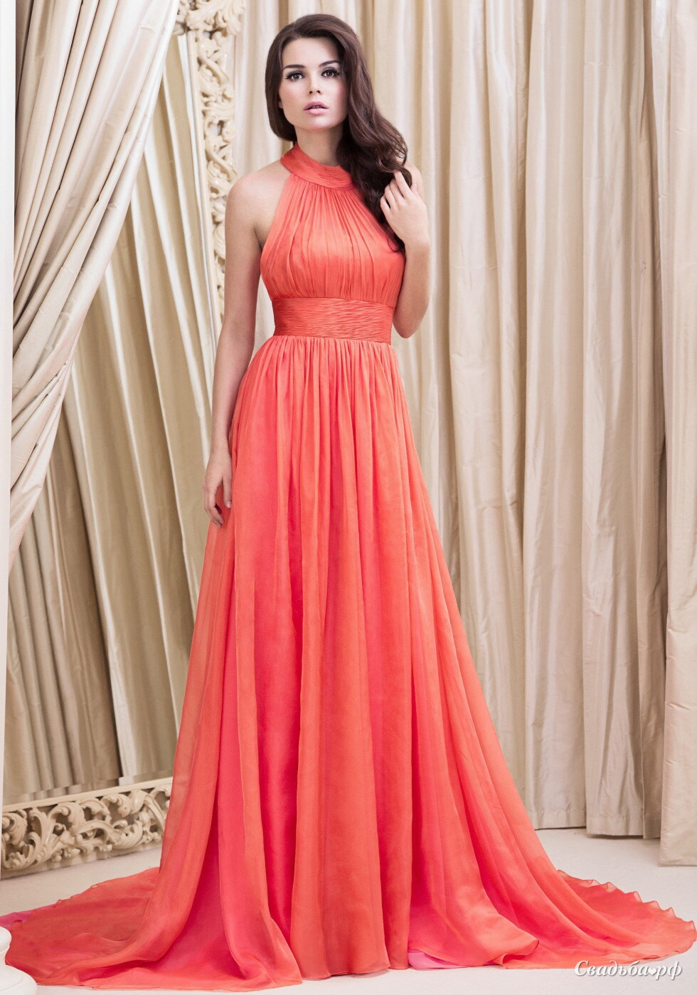 Женственное вечернее платье в пол кораллового цвета со шлейфом. Прекрасно подчеркивает талию за счет широкого обтягивающего пояса.