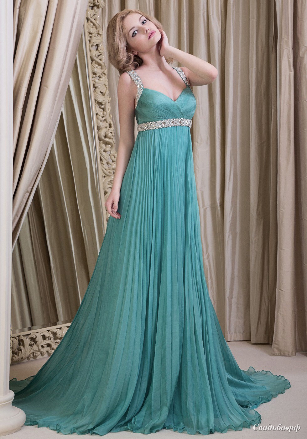 Вечернее платье в пол цвета морского бриза с узким расшитым пояском и узкими лямками.