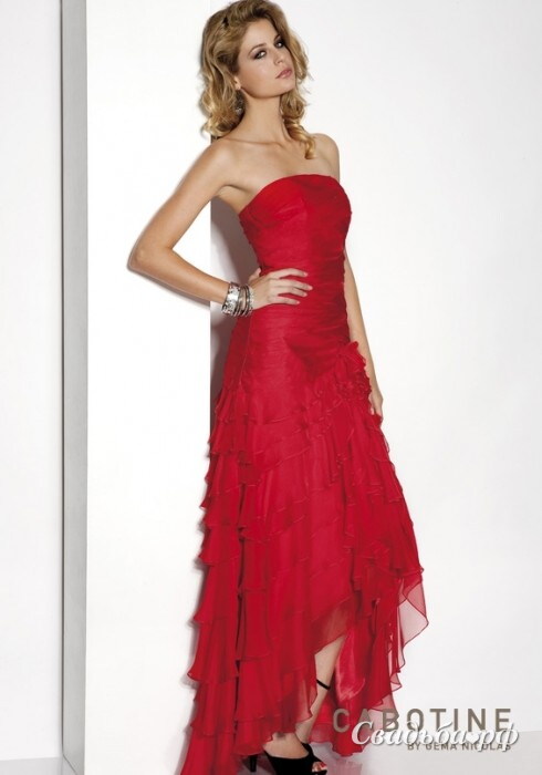 Роскошное вечернее платье насыщенного красного цвета. Прямой лиф и удлинённый корсет модели задрапированы. Короткая спереди и длинная сзади юбка состоит из множества лёгких оборок, которые красивым каскадом струятся вдоль фигуры. Записаться на примерку и узнать подробную информацию можно по телефонам: (495)637 3897, (495)637 4016.