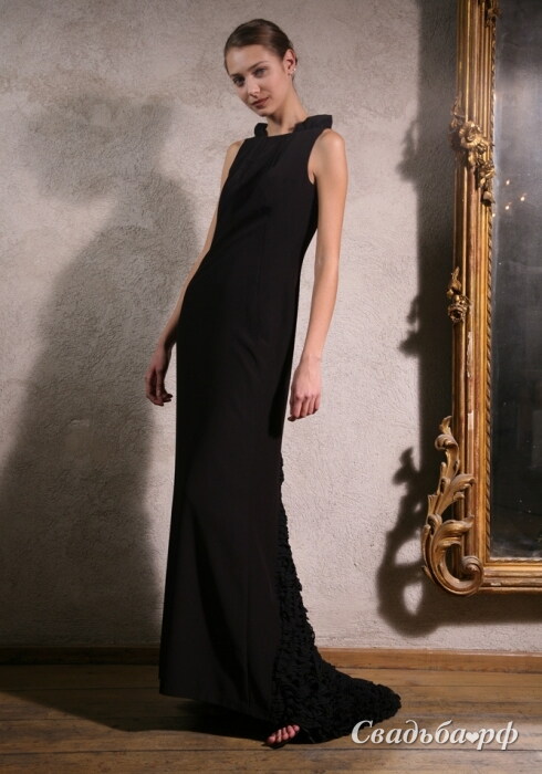 Очень элегантная модель со шлейфом. Платье выполнено из крепа таинственного чёрного цвета. Полуприлегающий покрой визуально стройнит и удлиняет силуэт. Шлейф задекорирован мелкими объёмными оборками, похожими на роскошный букет роз. Модель прекрасно подойдёт и для романтического свидания, и для серьёзного официального приёма.