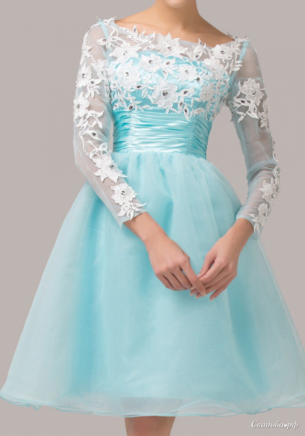 Вечернее (коктейльное) платье, материал - органза. Лиф с чашечками. Вырез выполнен в форме "лодочка". Верх платья с рукавами полностью расшит кружевом и бисером. Подчеркивающий пояс на талии. Спина полуоткрыта. Подкладка сатин. Состав: 100% полиэстер.