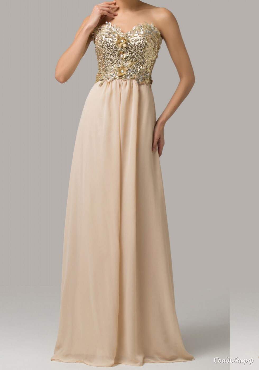Вечернее платье, материал - шифон. Бюст выполнен в виде корсета, полностью расшит маленькими пайетками. Бюст и пояс расшиты аппликациями и кристаллами. Подкладка - сатин. Лиф с чашечками. Шнуровка и молния. 100% полиэстер.