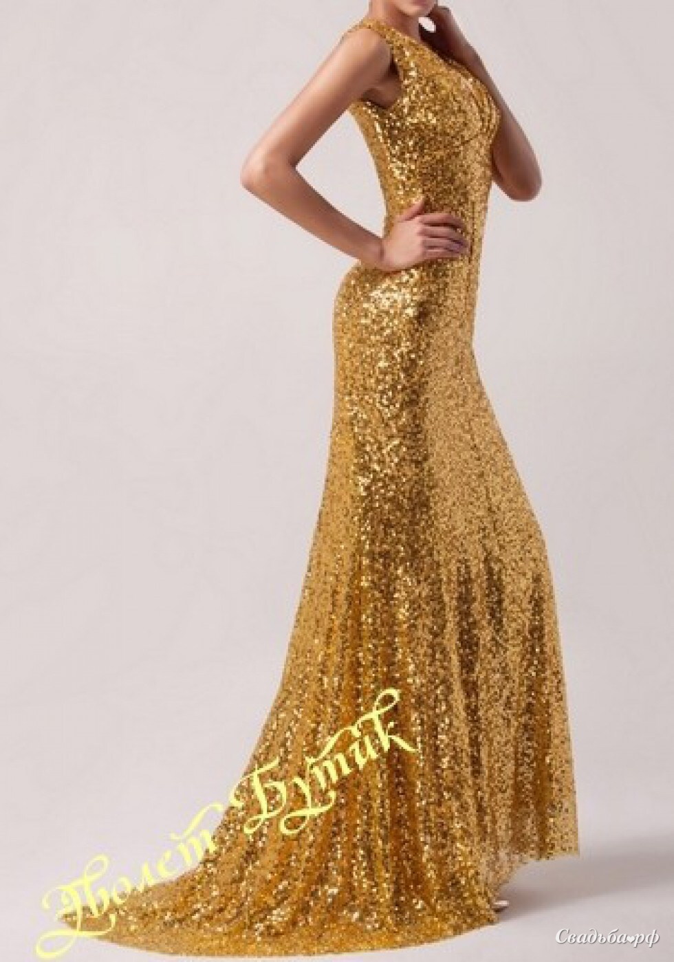 Вечернее (свадебное) платье с бретелями полностью расшито переливающимися пайетками. Лиф с чашечками. Спина полуоткрытая. Шнуровка. Подкладка сатин. Небольшой шлейф. Состав: 100% полиэстер.