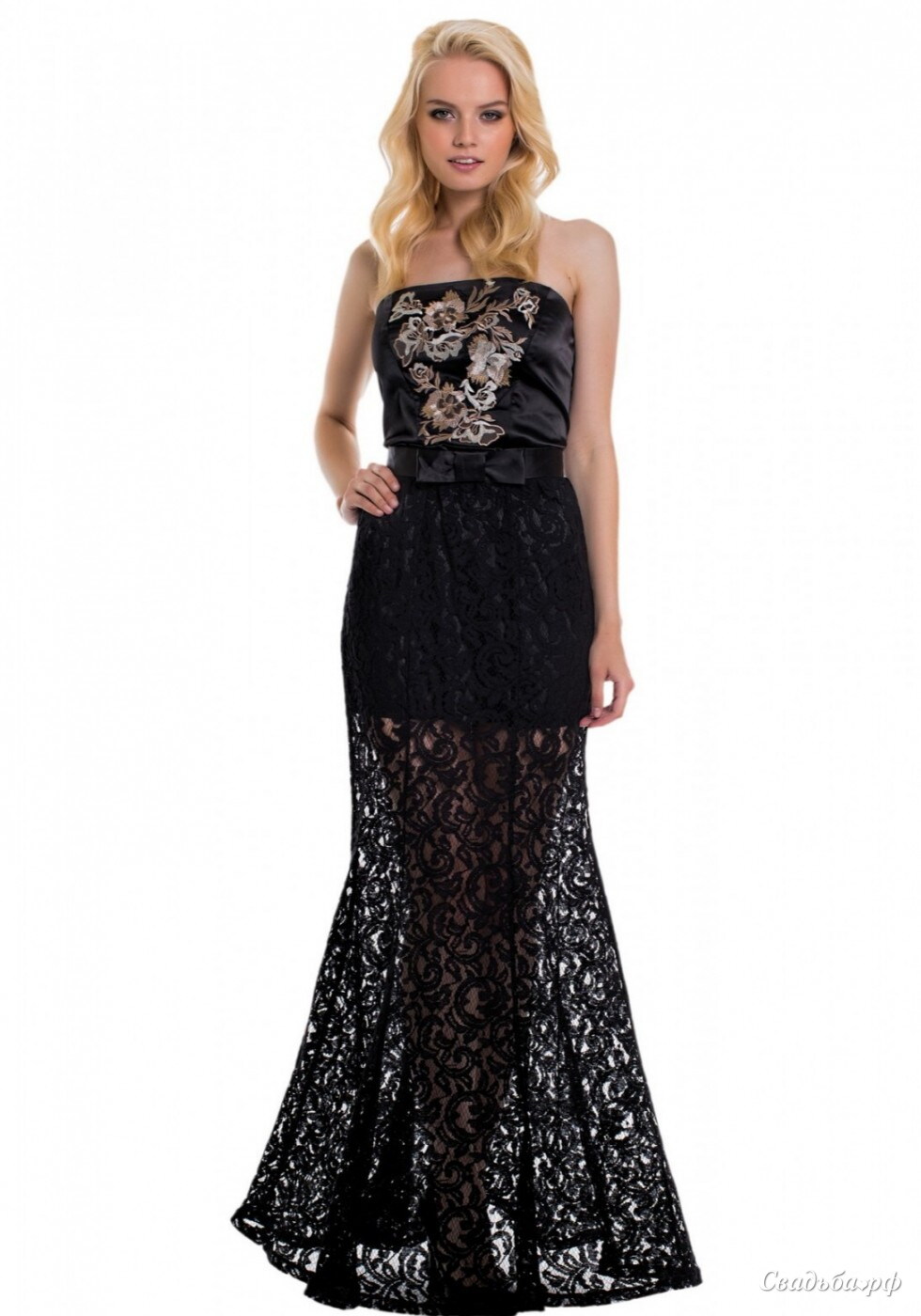 Вечерний комплект, состоящий из 2 частей — короткого платья-бюстье на съемных бретелях и съемной длинной юбки силуэта «русалка». Платье декорировано по переду вышивкой, по спинке — шнуровка. К платью прилагается съемный пояс из основного материала. Съемная юбка-макси выполнена из полупрозрачного гипюра. В комплекте к изделию прилагается болеро из гипюра.