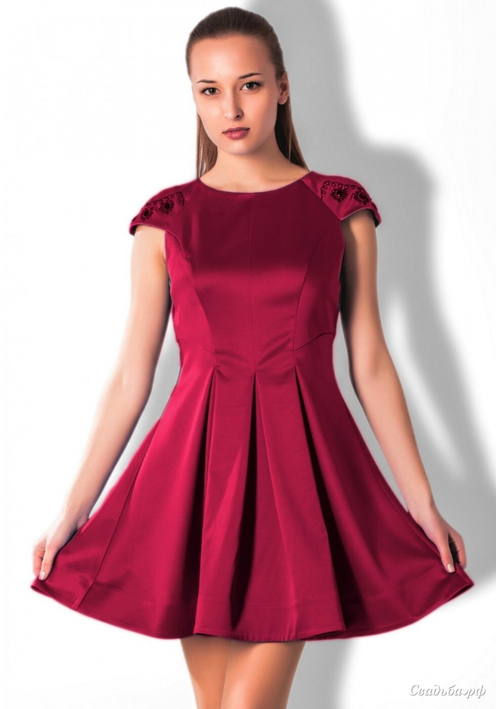 Платье нарядное из атласа-коттона Х-образного силуэта в стиле BABY DOLL. По переду и спинке застрочены глубокие склады в рельефах. Рукав-реглан с вышивкой шнуром и декором в виде камней. Низ изделия обработан широкой корсажной тесьмой.