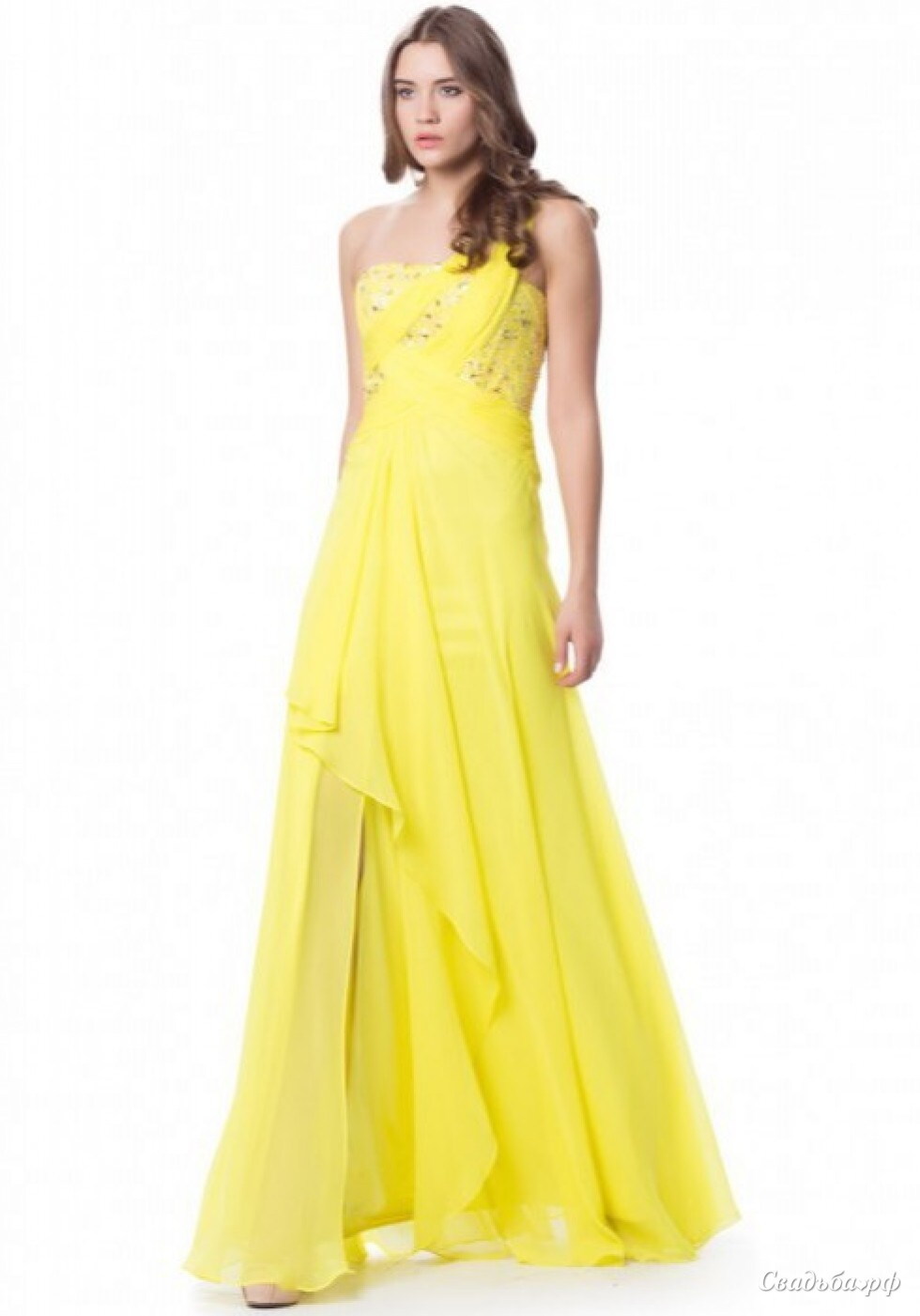Оригинальное вечернее платье из тончайшего шифона высокого качества в модном желтом цвете порадует любую модницу! Верх платья на одно плечо.. Стройности и элегантности придает косой крой, который призван скрывать все имеющиеся недостатки. Впереди корсетный лиф вышит яркими кристаллами и сверкающими крупными пайетками. Вдоль верхней части корсета - драпировка из полос той же ткани, переходящая в бретель. От линии талии спускается небольшая струящаяся драпировка, которая визуально вытягивает силуэт. Размеры: 44 (Грудь....90.2 Талия....72.4 Бедро....97.8 Длина изделия..158)