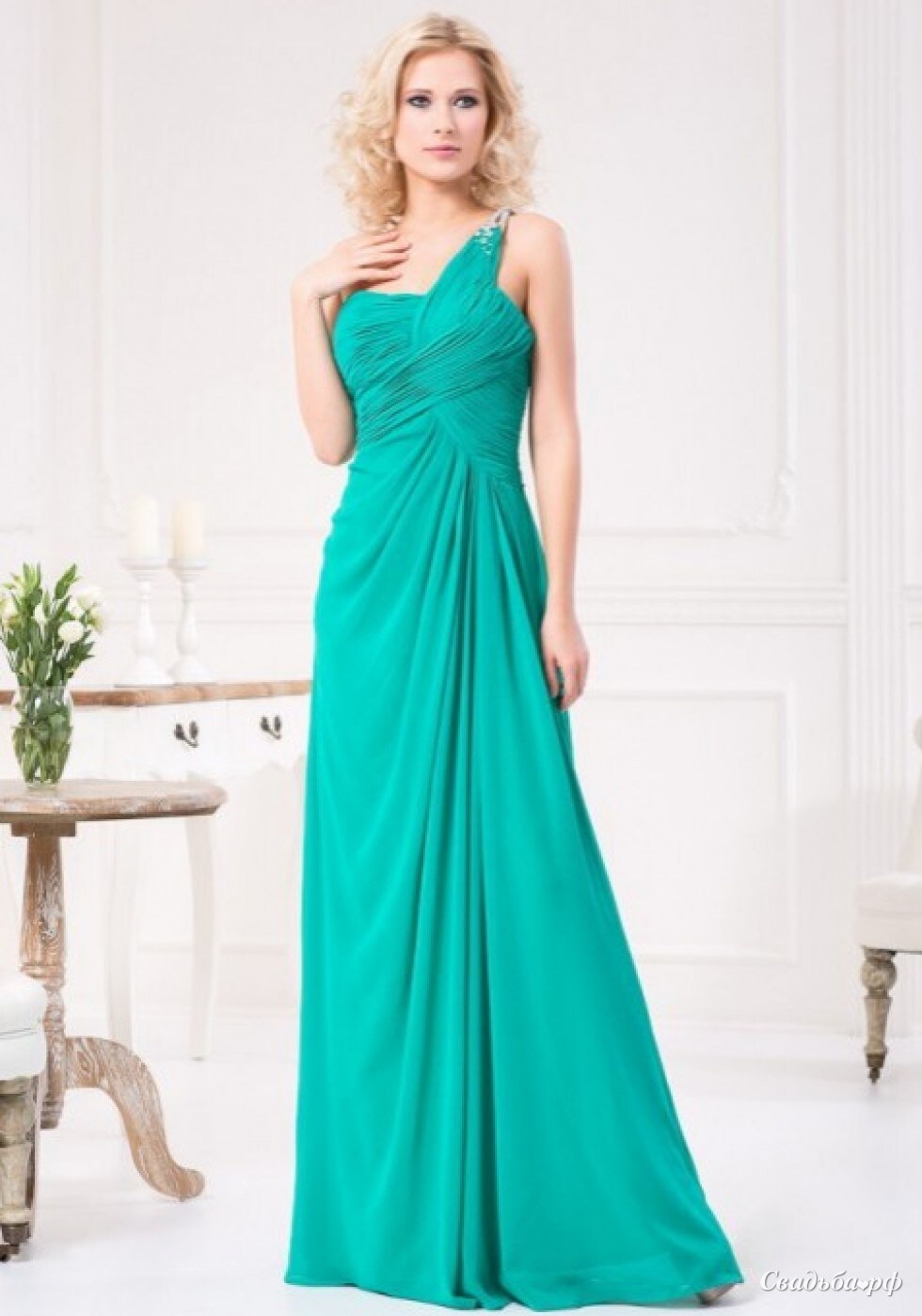 Великолепное вечернее платье из шифона высокого качества, станет отличным нарядом на любое торжество и поразит всех окружающих. Верх платья на одной плечо, с украшенной вручную сверкающими камнями Сваровски и стразами бретелью. Плотный корсет комфортно ложится к телу и поддерживает грудь. Вдоль талии небольшая интересная драпировка, которая успешно скрывает малейшие изъяны. Подкладка из трикотажа-стрейч без проблем садится и держит форму платья. Размеры: 42 (Грудь....86.3 Талия....67.3 Бедро....91.4 Длина изделия..155)