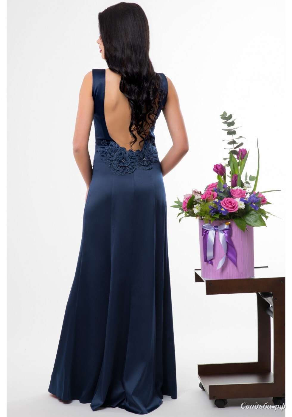 Длинное вечернее платье прилегающего Х-образного силуэта из плотного матового атласа выгодно подчеркнет фигуру. Крой «годе» создает силуэт «рыбка». На спинке глубокий овальный вырез, оформленный прозрачным фатином под цвет кожи. Ниже выреза пришит вышитый объемный цветочный декор из основной ткани, украшенный бусинами. Застежка в левом боковом шве на потайную тесьму-молнию.