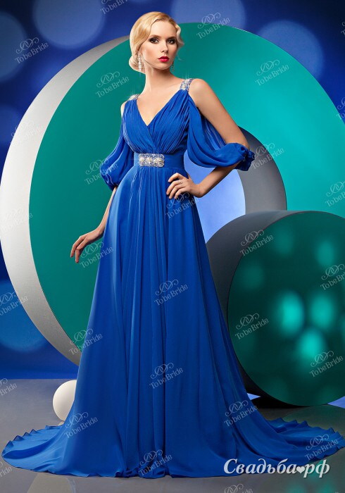 Эта великолепная модель подарит Вам множество незабываемых минут и тысячи прекрасных слов! Насыщенный цвет, эффектная драпировка и царственный полушлейф, богатый декор на бретелях и поясе, кокетливые полупрозрачные рукава с разрезами делают это платье достойным королевы.