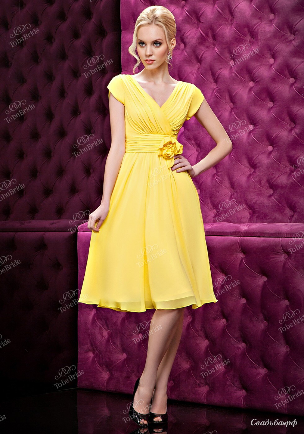 Эффектный вечерний наряд яркого жёлтого цвета поможет Вам выделиться на любом торжестве. V-образный вырез на груди смотрится кокетливо. Плечики закрыты. Талия подчёркнута широким поясом с изящным цветком. Юбка свободного кроя доходит до уровня колен. Лёгкое платье из нежного шифона особенно понравится жизнерадостным натурам.