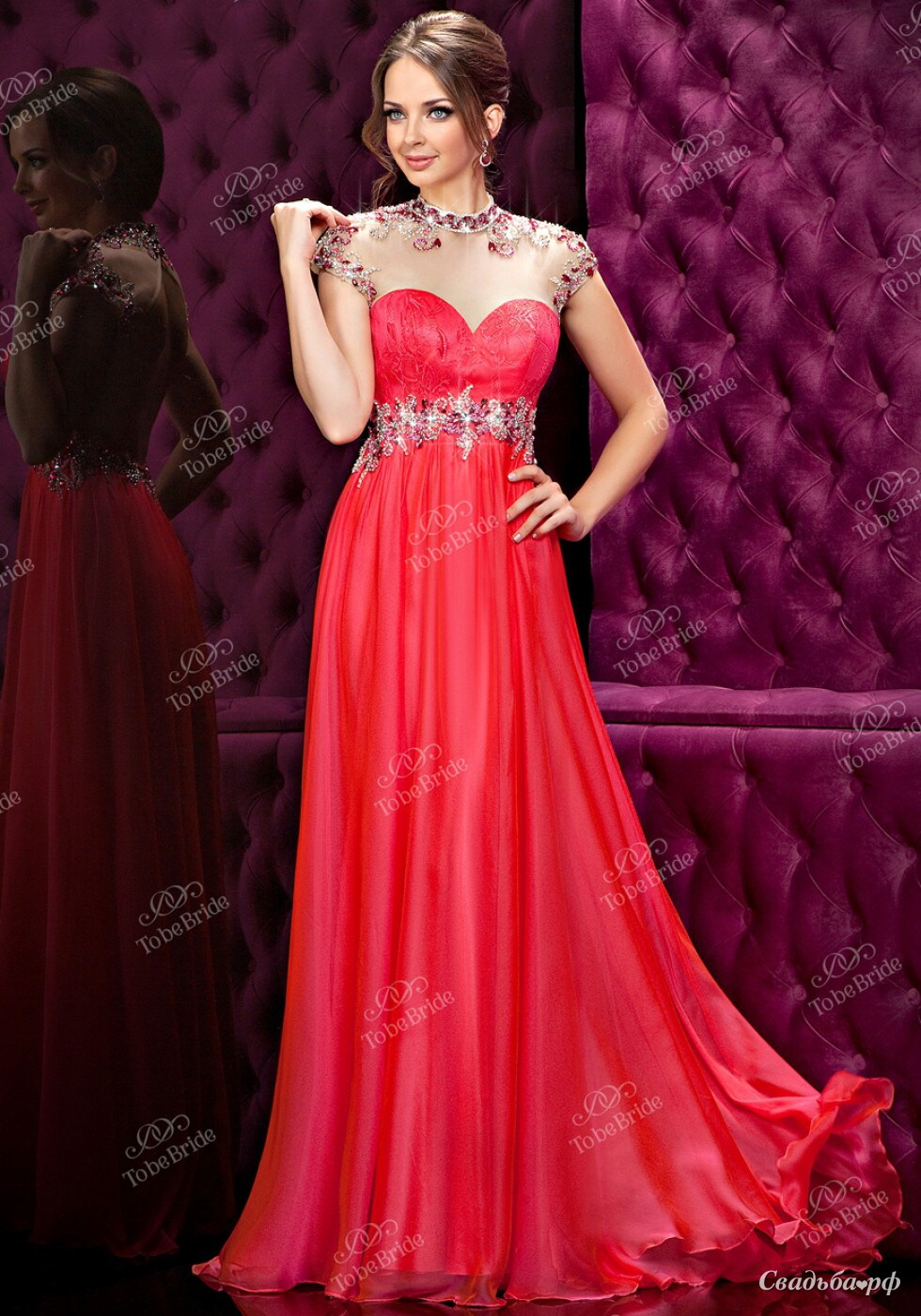 В ярком платье ультрамодного оттенка Вы будете центром любого торжества! Ошеломляющий эффект усиливается декором прозрачного лифа и пояса: крупные камни и стразы сияют просто ослепительно. Наряд привлекает внимание к бюсту и выгодно подчёркивает осиную талию своей обладательницы. Длинная юбка свободного кроя струится до самого пола.