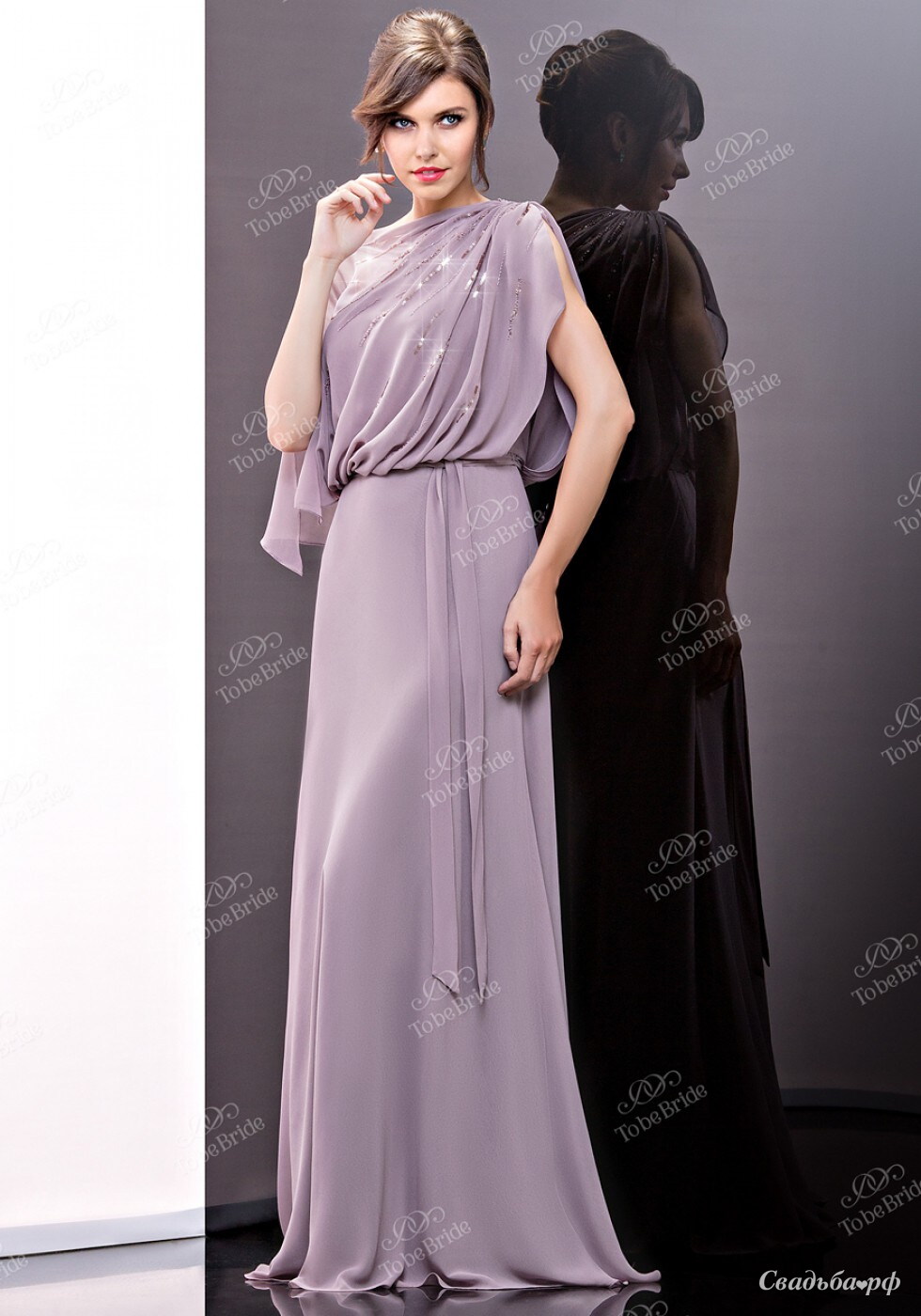 В изысканном сером платье с асимметричным плечом Вы сможете составить достойную конкуренцию красавицам античной Греции. Длинная юбка струится до самого пола и зрительно вытягивает силуэт. Талия подчёркнута пояском. Этот наряд не перегружен декором, благодаря чему смотрится элегантно. Истинный образец безупречного вкуса!