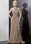 Эффектное платье песочного оттенка отличается необычным кроем и разнообразием текстур: гладкий, скользящий шифон юбки сменяется плотными складками драпировки пояса. Кружевной верх наряд скромно закрывает зону декольте. Длинная юбка с вертикальным воланом струится до самого пола и зрительно вытягивает силуэт. Вы будете подобны богине!