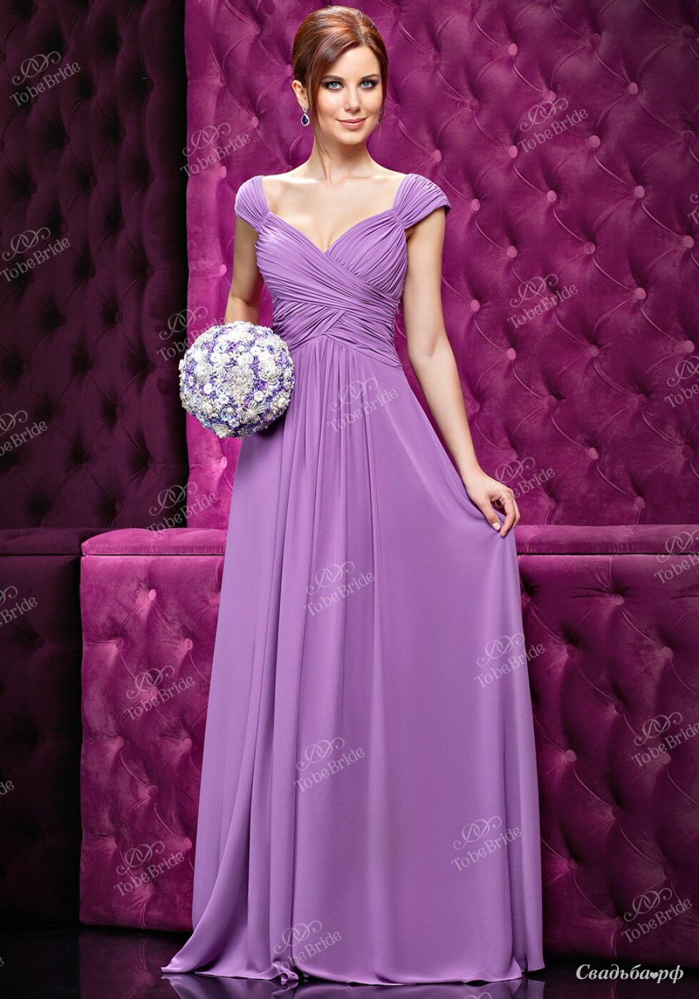 От легкого платья нежно-сиреневого оттенка с завышенной талией и изящными драпировками так и веет весенней свежестью. Открытая зона декольте обрамлена широкими бретелями-плечиками. Наряд не перегружен декором, благодаря чему смотрится изысканно. Реальное время года не имеет никакого значения! Нежность этого образа актуальна в любом сезоне!