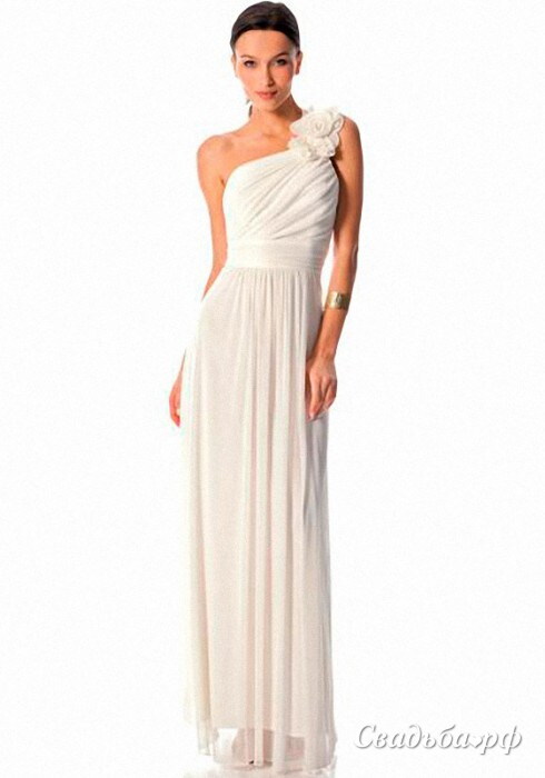Восхитительное платье в греческом стиле создано для самых утончённых и притязательных модниц. Драпированный корсет с открытой зоной декольте, единственной бретелью и объёмными цветами на плече выделит вас на любом торжестве. Широкий пояс подчёркивает талию. Длинная юбка прямого покроя струится до самого пола и зрительно вытягивает силуэт.