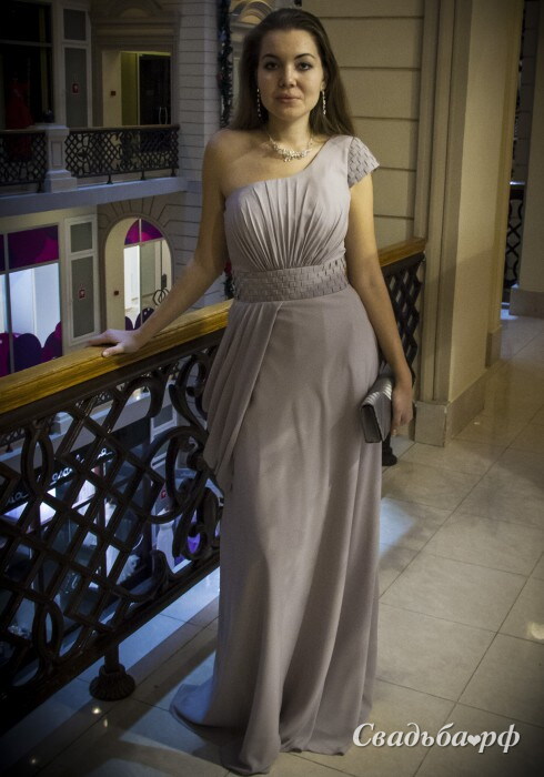 Элегантное вечернее платье в пол изготовлено из серого шифона. Жесткий лиф драпирован мелкими вертикальными складками, асимметричная бретель на одно плечо с соломенным рукавчиком, линию талии удачно подчеркивает пояс в таком же стиле. Слева на юбке, которая помогает проследить идеальную силуэтную линию, тканая полукруглая сборка.