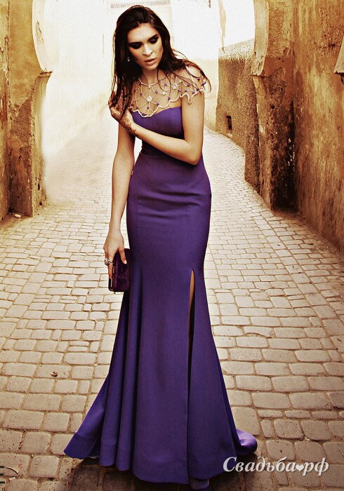 Закрытое вечернее платье с кристаллами насыщенного фиолетового цвета. Зона декольте и плечи кокетливо прикрыты украшенным кристаллами воротом-сеткой. Лиф – открытый, фигурный. Длинная, расширенная книзу юбка с высоким разрезом предоставляет прекрасную возможность продемонстрировать стройные ножки. Настолько изысканный наряд достоин настоящей принцессы!
