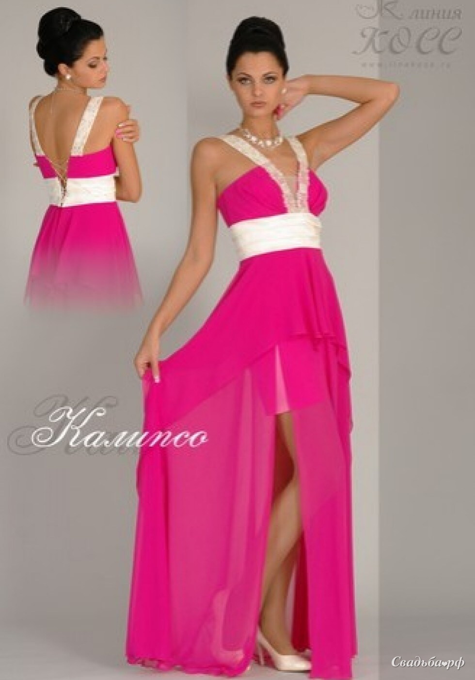 открытая зона декольте привлекает внимание к бюсту. Длинная юбка, платье струится до самого пола. Пикантный разрез на юбочке позволит Вам продемонстрировать свои прекрасные ножки. Эффектное платье для торжества.
