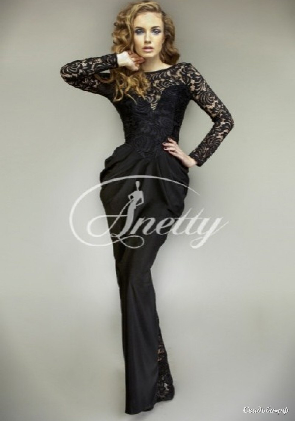 Длинное трикотажное платье с гипюровым верхом, рукавами и V-образным вырезом на спине. Зауженная к низу юбка с гипюровой вставкой сзади.