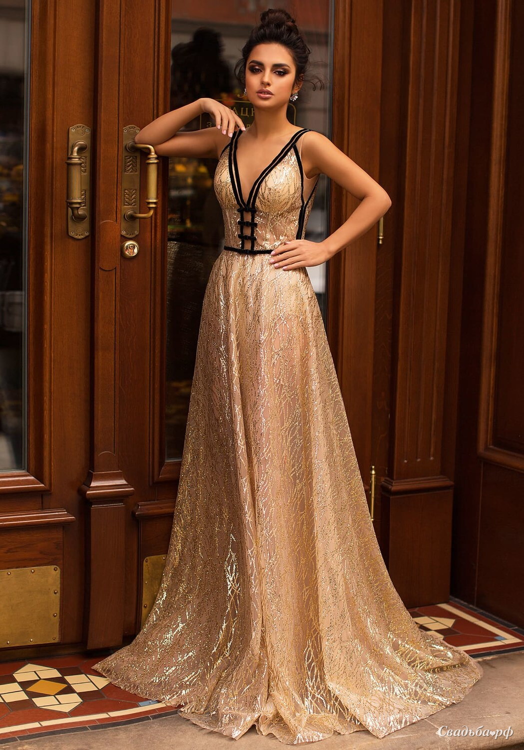 Мерцающее вечернее платье с V-образным вырезом на линии декольте и спинке.