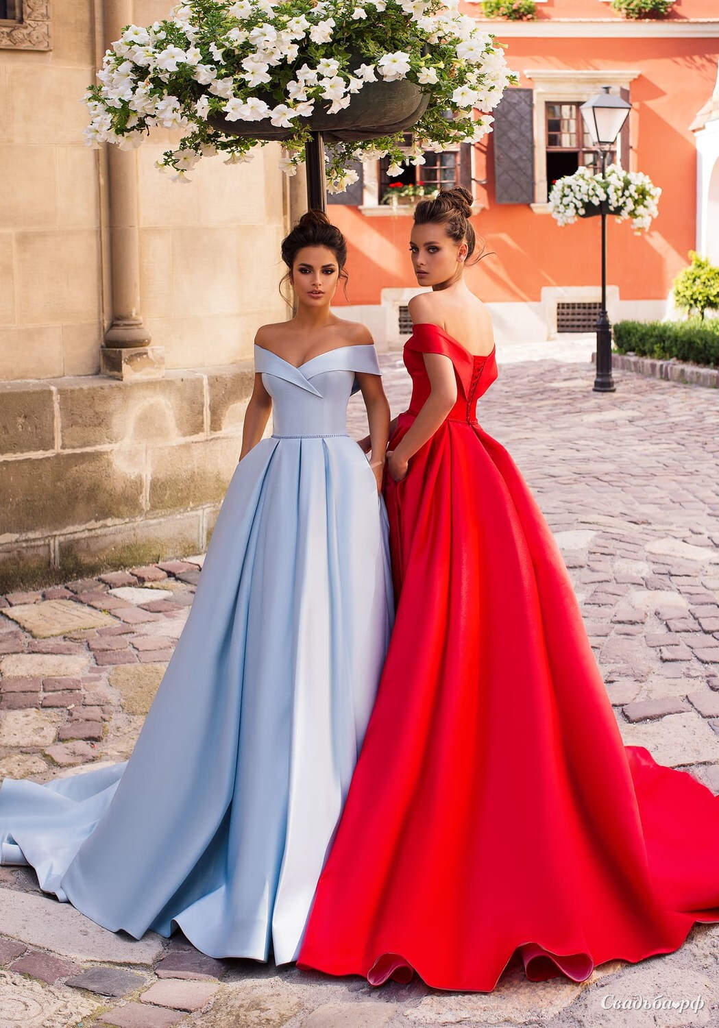 Классическое вечернее платье с портретным декольте и спущенной линией плеч.