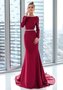 Лаконичное вечернее платье винного цвета с открытой спиной, вырезом «лодочка» и длинными рукавами.