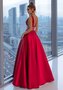 Пышное красное вечернее платье с юбкой из атласа. Спина открыта, акцент на талии благодаря широкому поясу светлого оттенка.