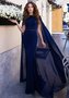 Запоминающееся вечернее платье силуэта «русалка» с кейпом. Плотная ткань насыщенного темно синего оттенка подчеркивает фигуру, а легкая накидка добавляет образу воздушности.