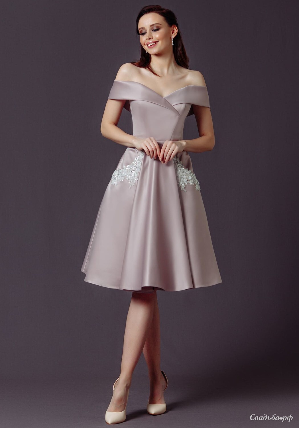 Коктейльное платье с портретным декольте, скроенным на запах, дополнено спущенными бретелями. Платье выполнено в стиле минимализм, декор из мерцающих бусин выполнен только на карманах платья.