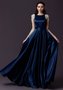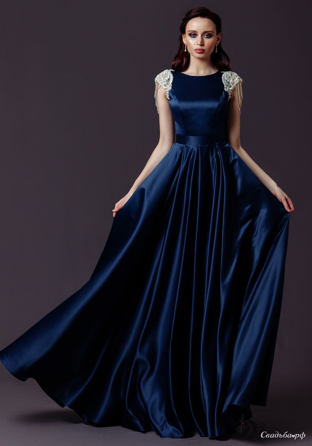 Темно-синее длинное вечернее платье. Струящаяся юбка с бантовыми складками спускается в пол складками, а спинка платья открыта глубоким вырезом.