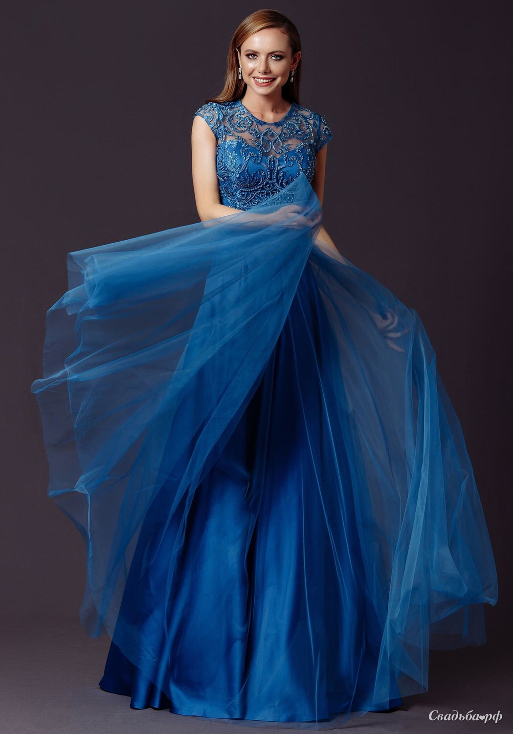 Оригинальное вечернее платье кроя топ лазурного цвета. Топ украшен мерцающими камнями и бисером, а юбка с пышного фатина добавляет образу игривости и воздушности.