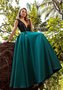 Яркое вечернее платье с кружевным лифом с глубоким V-образным вырезом черного цвета и юбкой из атласа изумрудного оттенка.