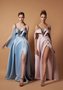 Длинное вечернее или выпускное платье оригинального кроя в нежно-голубом или пудрово-розовом цвете.С высокими разрезами и широкими спущенными рукавами.