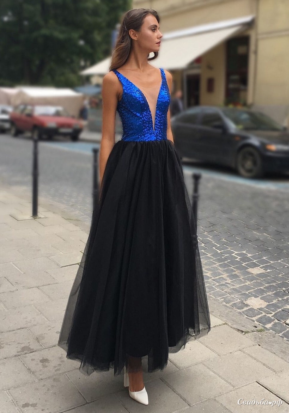 Яркое вечернее платье с юбкой из черного пышного фатина и корсетом расшитым пайетками. Платье идеально подойдет как для выпускного вечера, так и для корпоратива.